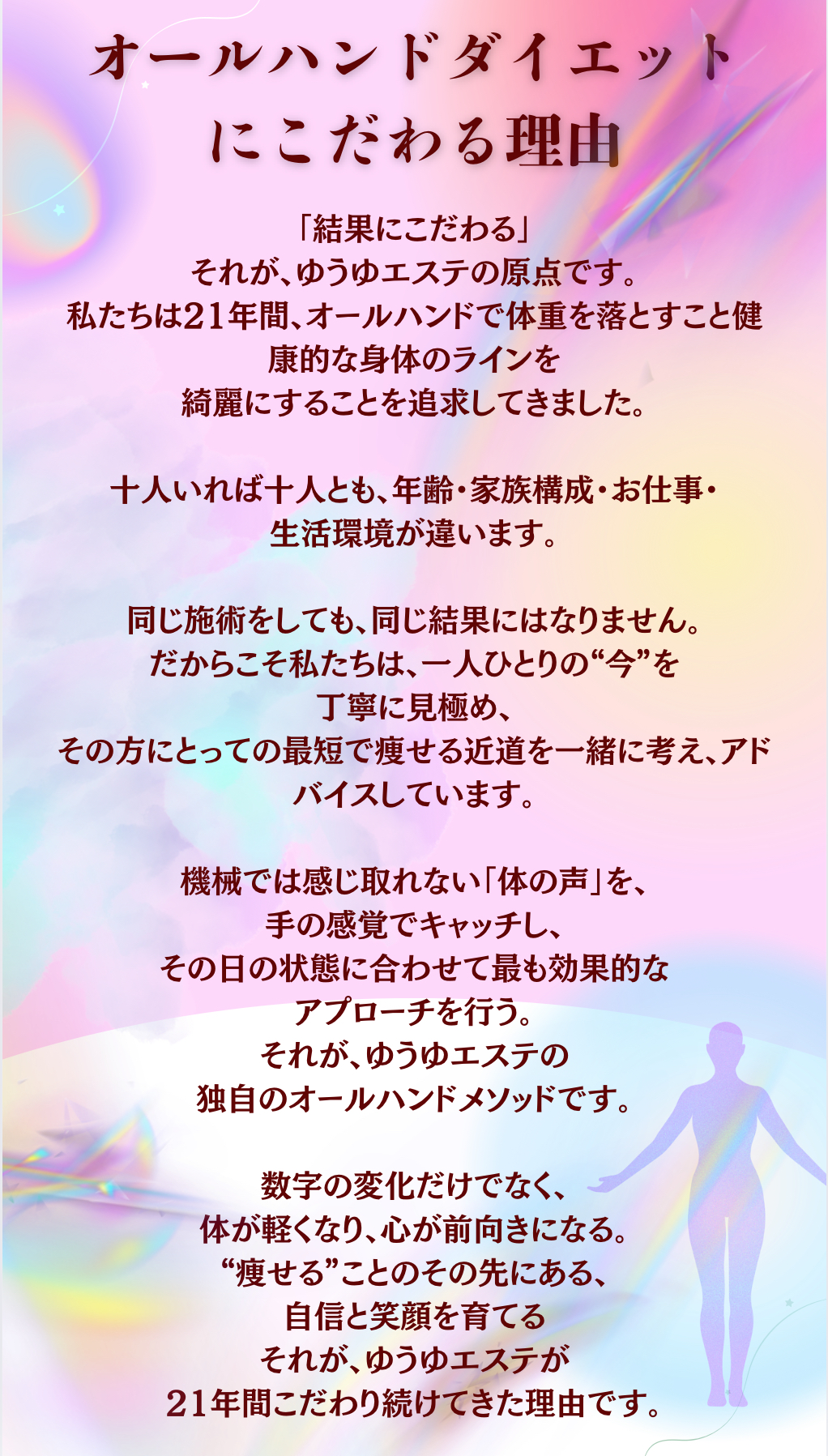 ゆうゆのダイエットコースとは、汗をしっかり出しながら独自のオールハンド施術で、・セルライト・脂肪・老廃物・贅肉を体外に排出していきます。脂肪の燃焼はもちろんですが、内臓脂肪にもアプローチしていきます。体に溜まっている老廃物をしっかりと排出し、オールハンド施術で脂肪や硬くなったセルライトを柔らかくする事で体質改善し、痩せやすい体へと導いていきます。