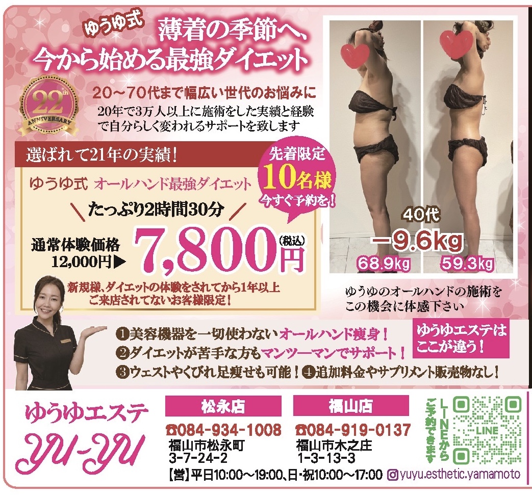 2026年03月25日 Instagram♡明日への元気の応援団 ゆうゆエステ🔍のInstagramは 施術内容、美容情報、お店の雰囲気、 ゆうゆのお客様への想いを投稿しています😃 オールハンド痩身ダイエットの お客様のBefore &afterも 多数掲載しています😃 是非フォローしてください😊
